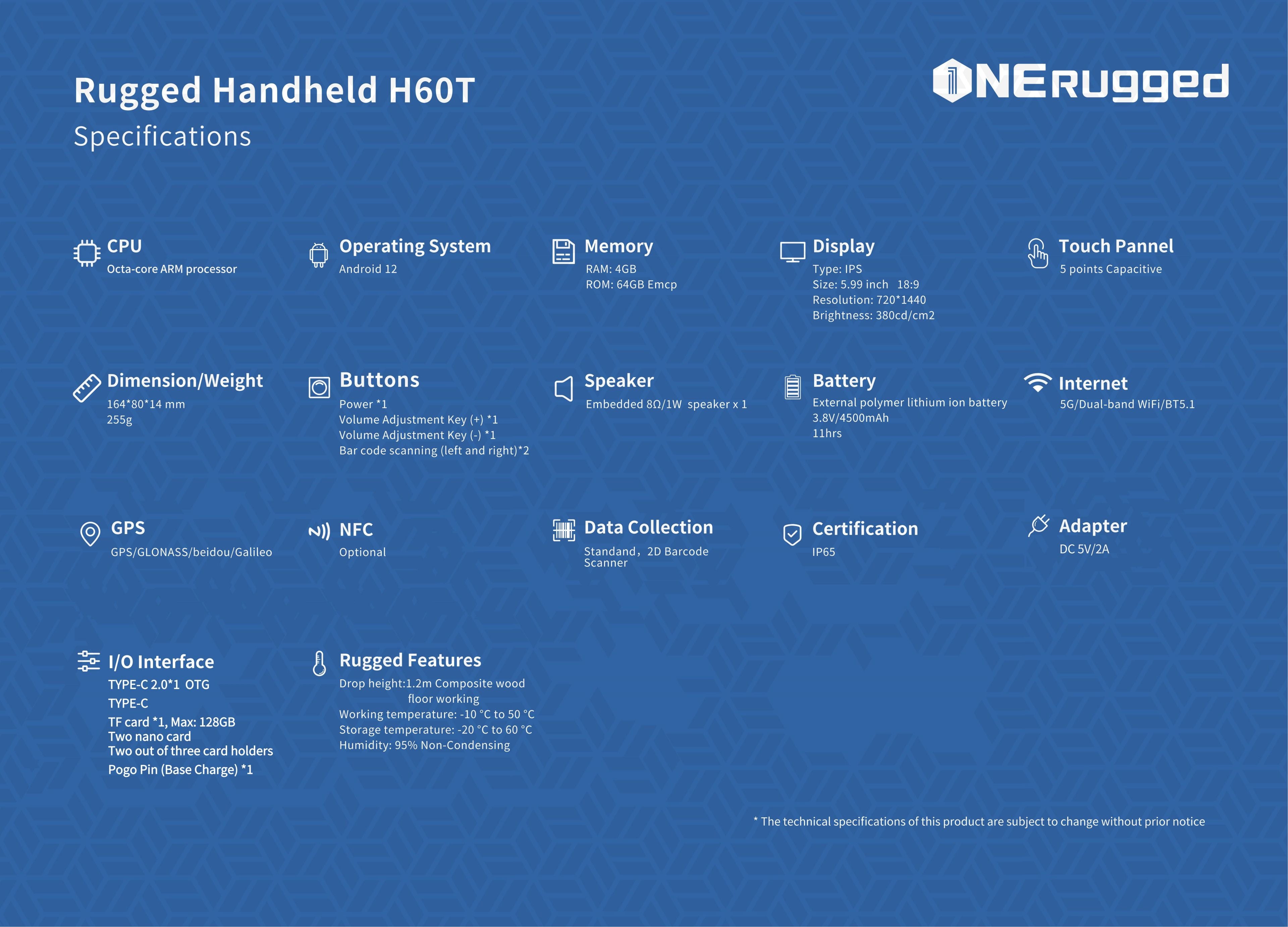 Rugged design with a IP-65 rated waterproof, built to survive temperature changes, drops, shock, and vibration, MIL-STD-810H Certified, Operating temperature: -10 °C to 50 °C
