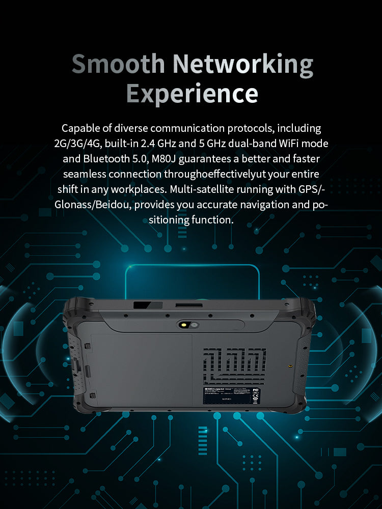 Built-in 2.4GHz and 5GHz dual-band WiFi provides fast, reliable connections in any workplace, while the 2G/3G/4G network support (with 1 Nano SIM card slot), Bluetooth 5.0 and NFC ensure communication and data transfer capabilities in the field. With GPS/Glonass/Beidou for multi-satellite navigation, the M80J offers precise positioning and tracking.