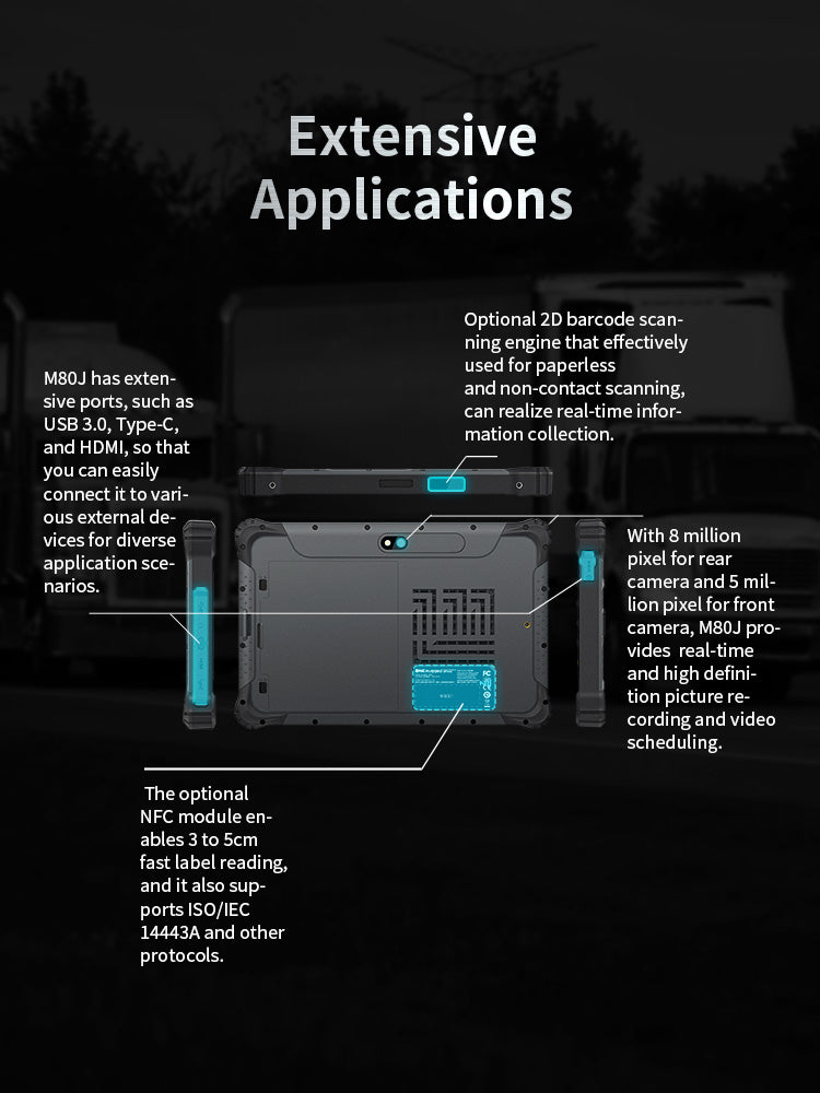 The NFC functionality of the M80J Rugged Tablet may require custom application development based on your specific needs. We provide a test app to verify that the NFC feature is working correctly and can provide NFC development resources, but implementation should follow standard Windows NFC methods. For NFC payment or other specific applications, additional resources and system integration may be required.