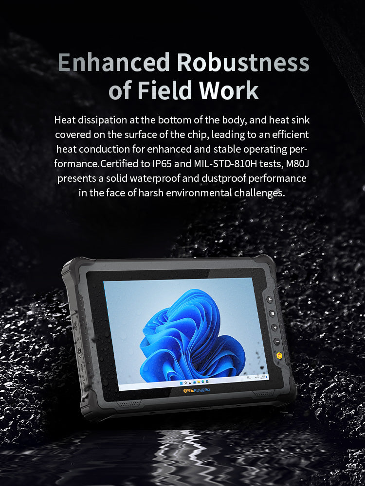 The M80J Rugged Tablet is rigorously tested to MIL-STD-810H standards, ensuring reliable performance under extreme temperatures, vibrations, and impacts. Additionally, its IP65 rating effectively resists dust and water splashes.