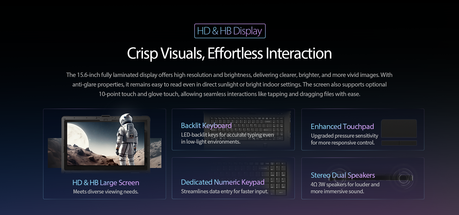 15.6" FHD 1920×1080 Display, 1000 nits – Sunlight-readable screen for outdoor visibility